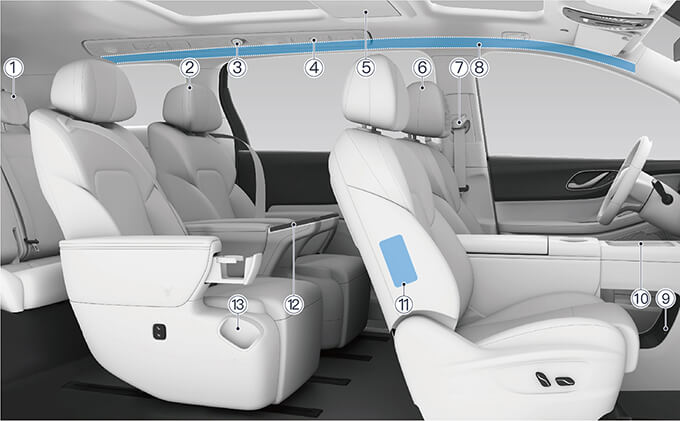 | ① 第三排座椅 | ⑧ 侧气帘 |