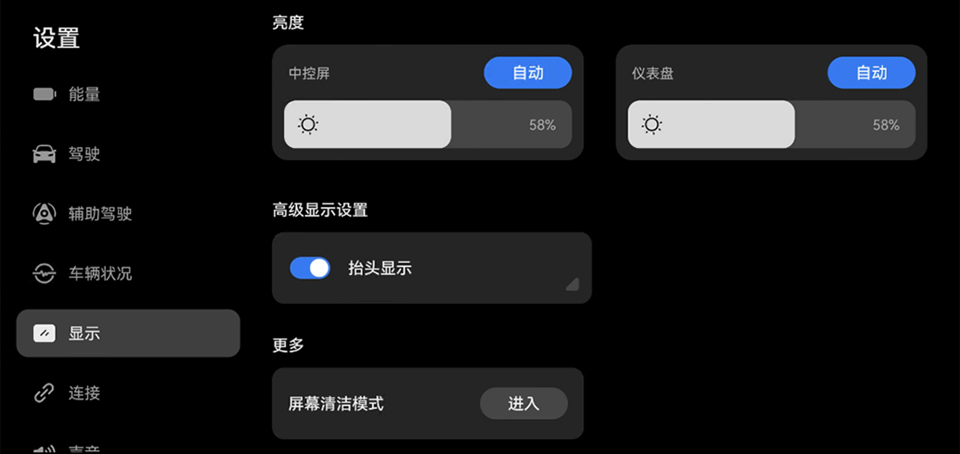 1. 在中控屏设置 > 显示 > 高级显示设置界面,打开“抬头显示”开关。