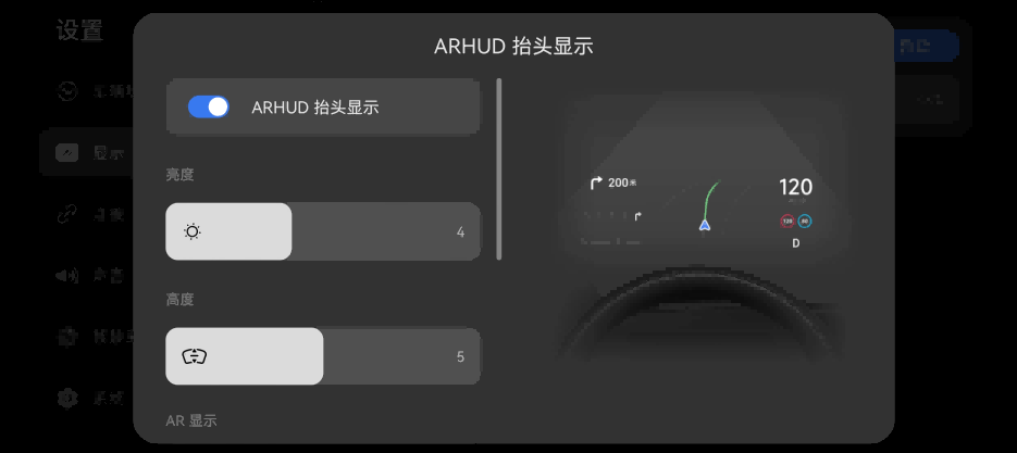 1. 点触“抬头显示”开关,进入设置界面,调节抬头显示的亮度和高度。