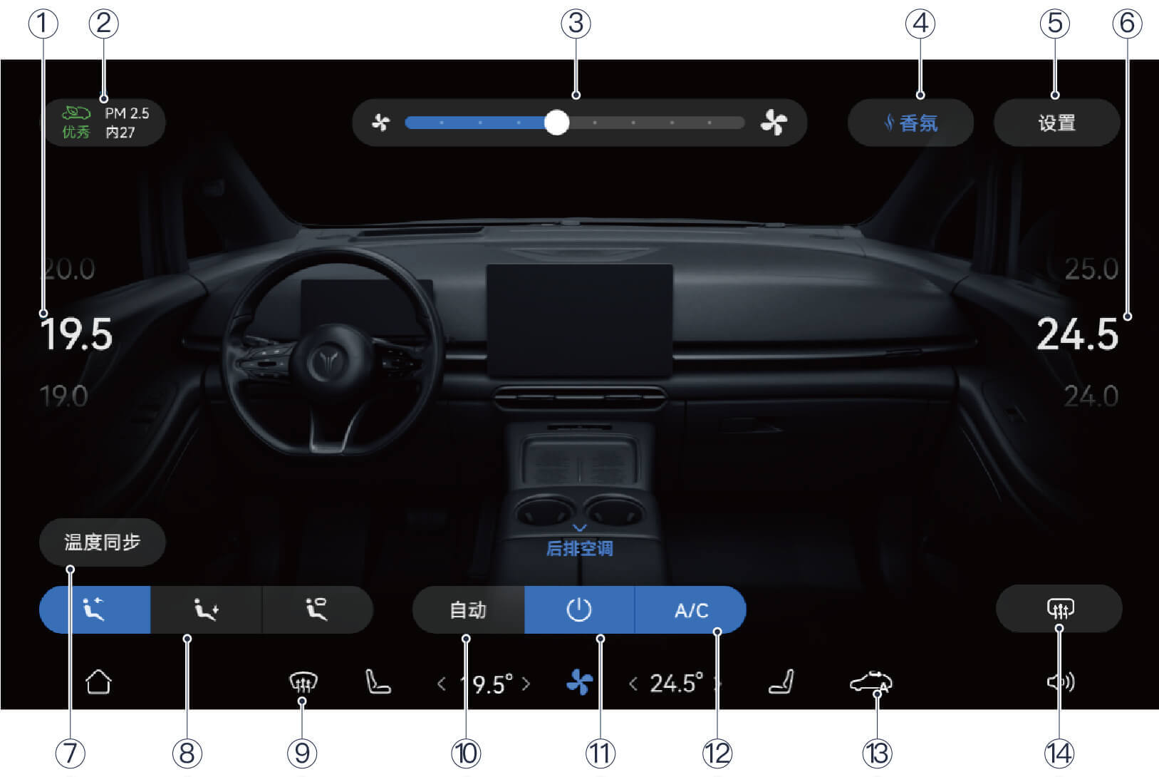 | ② 空气净化 | 显示当前车内 PM2.5 浓度值。点触可开启或关闭空气净化功能。 |