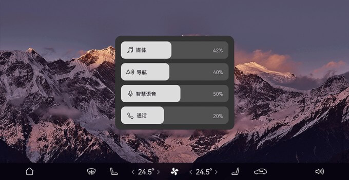 ,可分别调节“媒体”、“导航”、“智慧语音”、“通话”的音量大小。若媒体、导航、智慧语音的音量调节超过 60%,下一次启动车辆后,该音量将自动调节到 59%。