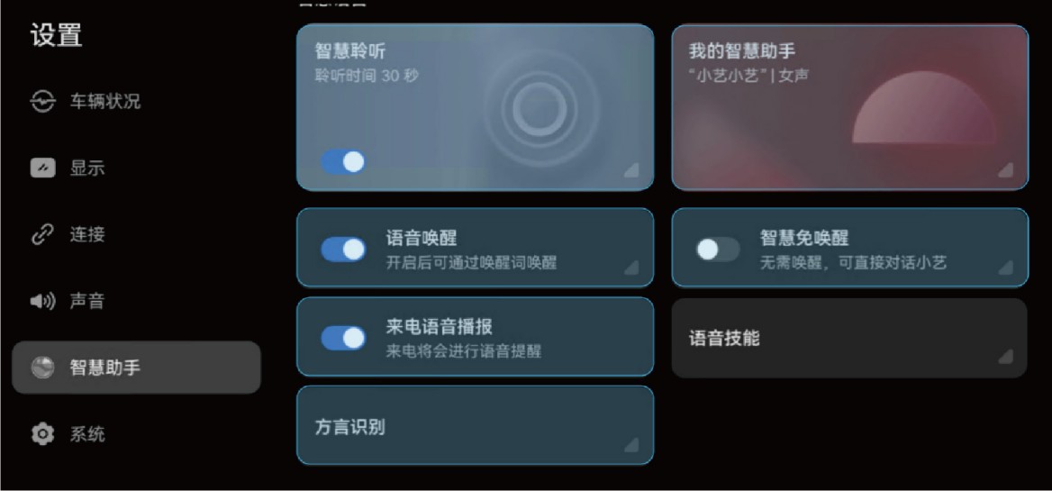 您可以在中控屏设置 > 智慧助手 > 智慧语音界面中设置以下功能。