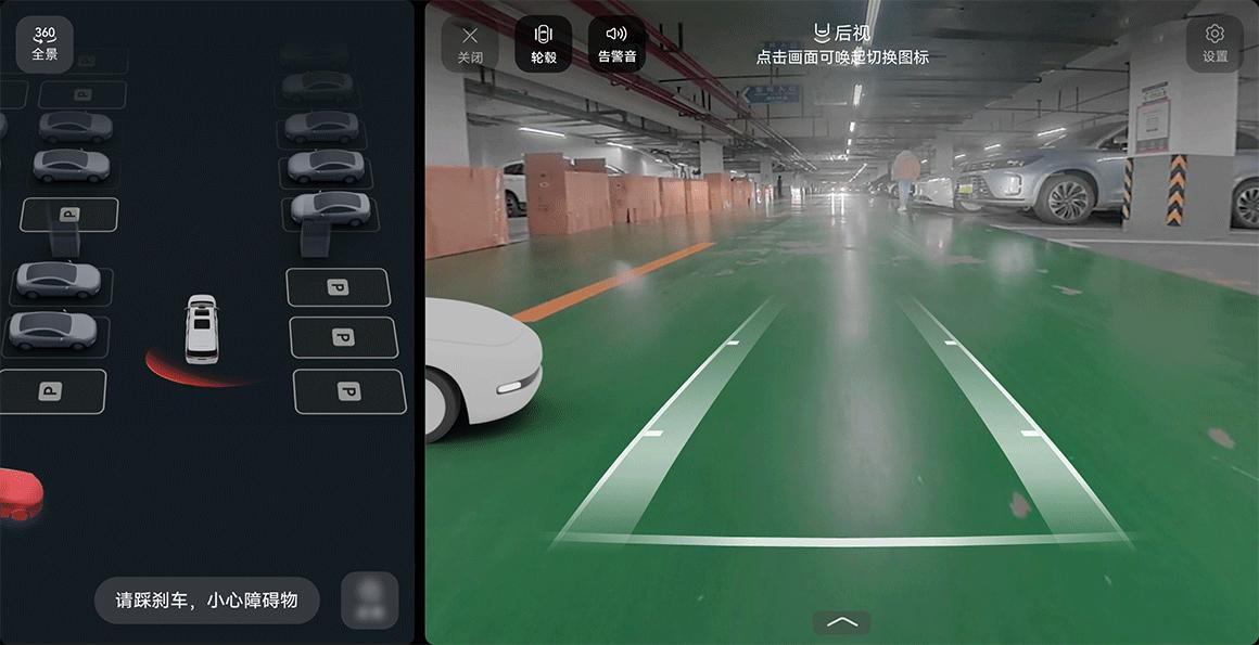 实施 RCTB 时,中控屏上会在自车侧后方来车方向显示动态红色弧线,并将风险目标红色高亮显示,伴有“请踩刹车”的文字提示,提醒驾驶员采取制动措施。