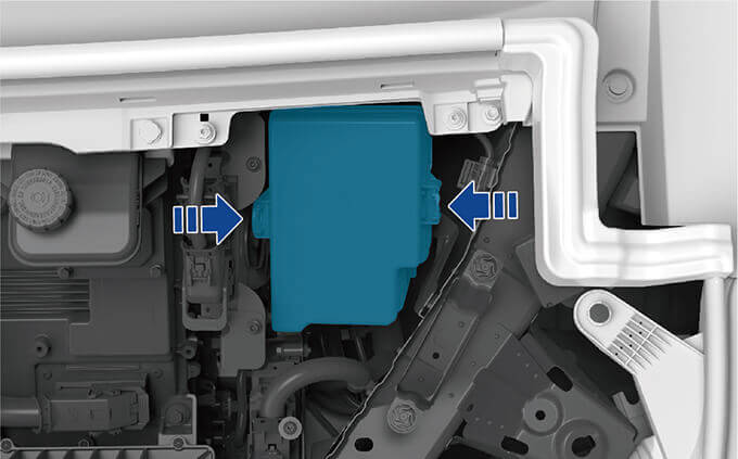 - 沿上图箭头方向按压固定卡扣,打开保险盒盖;