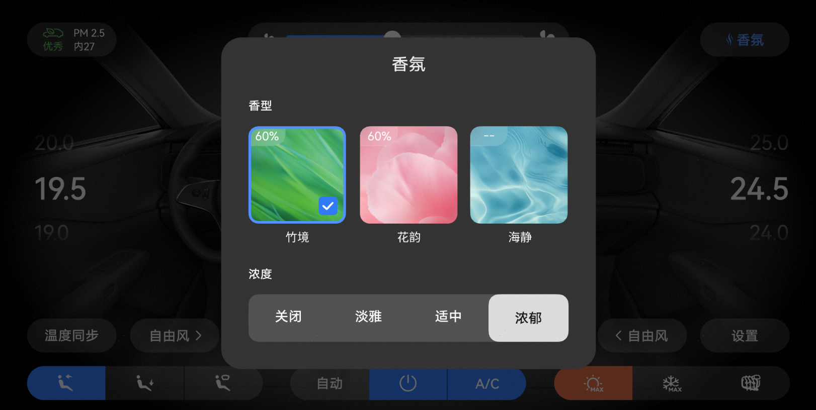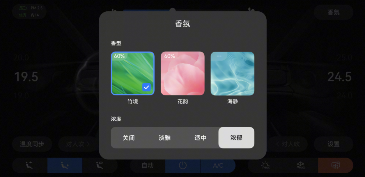 在中控屏工具栏中部点触空调区域,再点触弹窗右上角的,进入空调设置界面,点触“香氛”,选择不同“香型”、香氛“浓度”或“关闭”香氛系统。