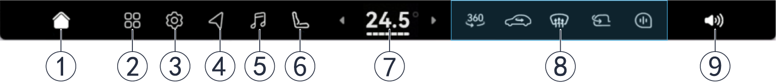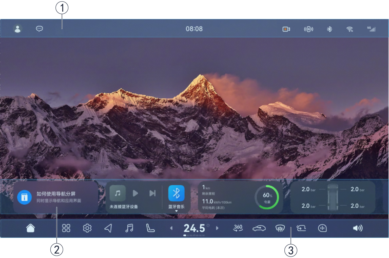 | ③ 工具栏 | - Home 键、应用中心、设置、导航、音乐、座椅、空调、原子化车控区和音量。 - 长按 Home 键进入多任务中心,可以快速查看、进入、关闭最近任务。 |