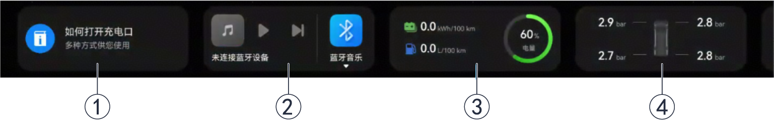 | ④ 胎压卡片 | 可以实时查看胎压信息,也可点触卡片可进入“设置 > 车辆状况”界面。 |