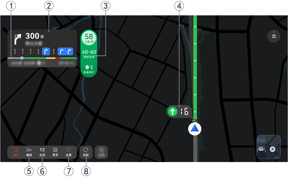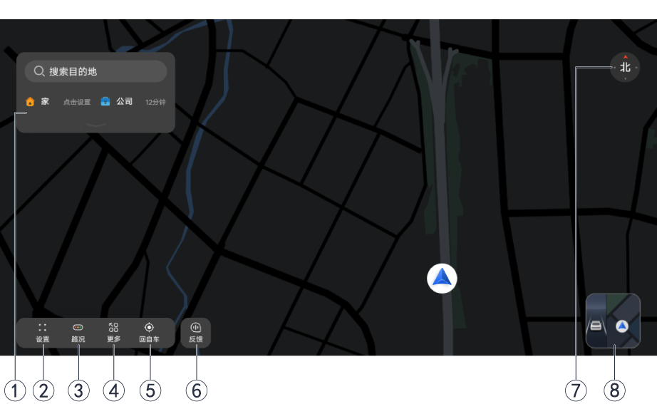 | ⑦ 视角切换 | 切换不同导航视角。默认为 2D 车头正北向上视角,可点触切换 2D 车头向上、3D 车头向上视角。 |