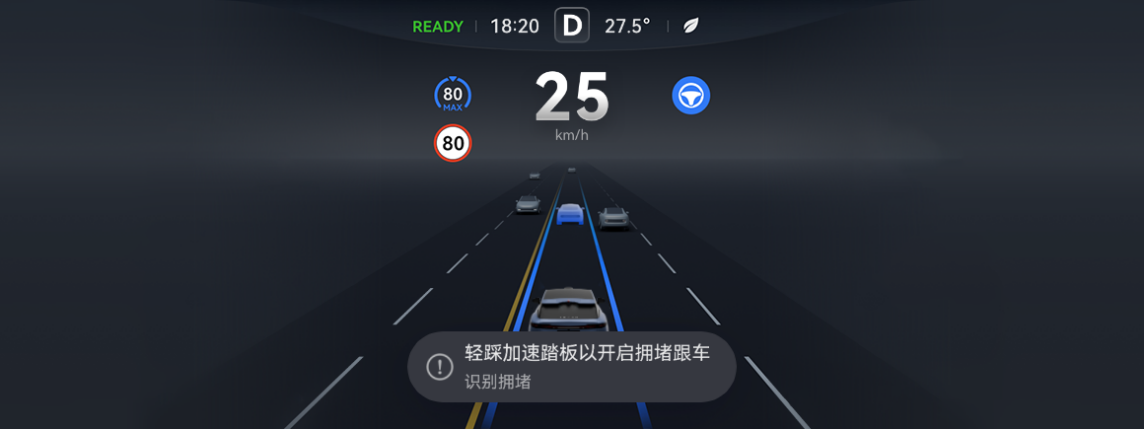 进入拥堵跟车模式时,组合仪表屏上会显示“已开启拥堵跟车”的提示。该提示会在显示数秒后消失。
