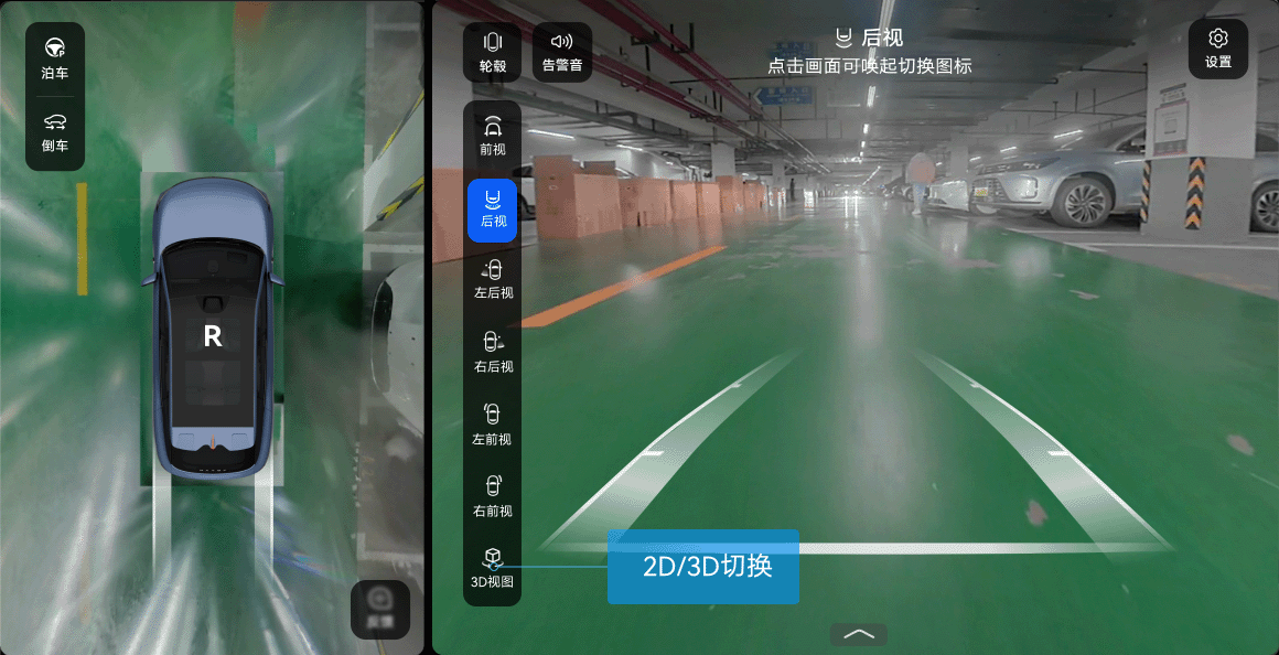 点触中控屏右侧影像中的,可开启或关闭障碍物告警提示音。点触右侧影像区域,可打开多视角图标切换栏,具体包括:2D 和 3D 切换、左右视图等多视角切换图标,详细参阅2D 和 3D 视图切换。