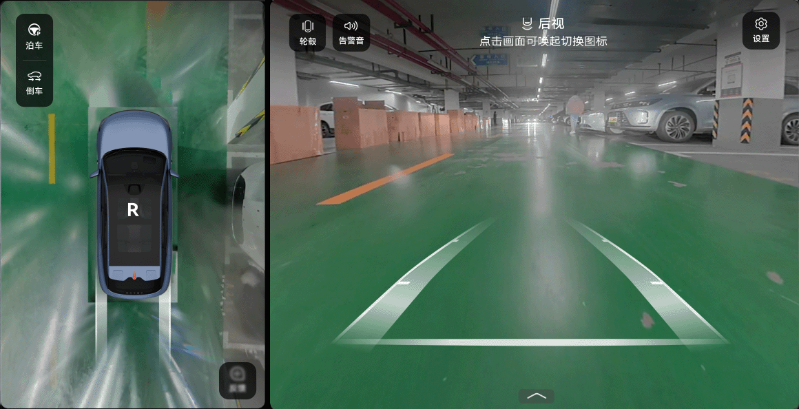 挂 R 挡(请确认中控屏的“设置 > 辅助驾驶 > 全景环视”已设置了挂 R 挡默认打开 “360° 全景环视”)。
