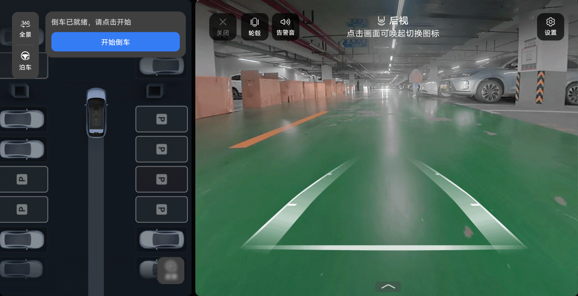 - 挂 R 挡(请确认中控屏的“设置 > 辅助驾驶 > 全景环视”已设置了挂 R 挡默认打开“泊车辅助”)。