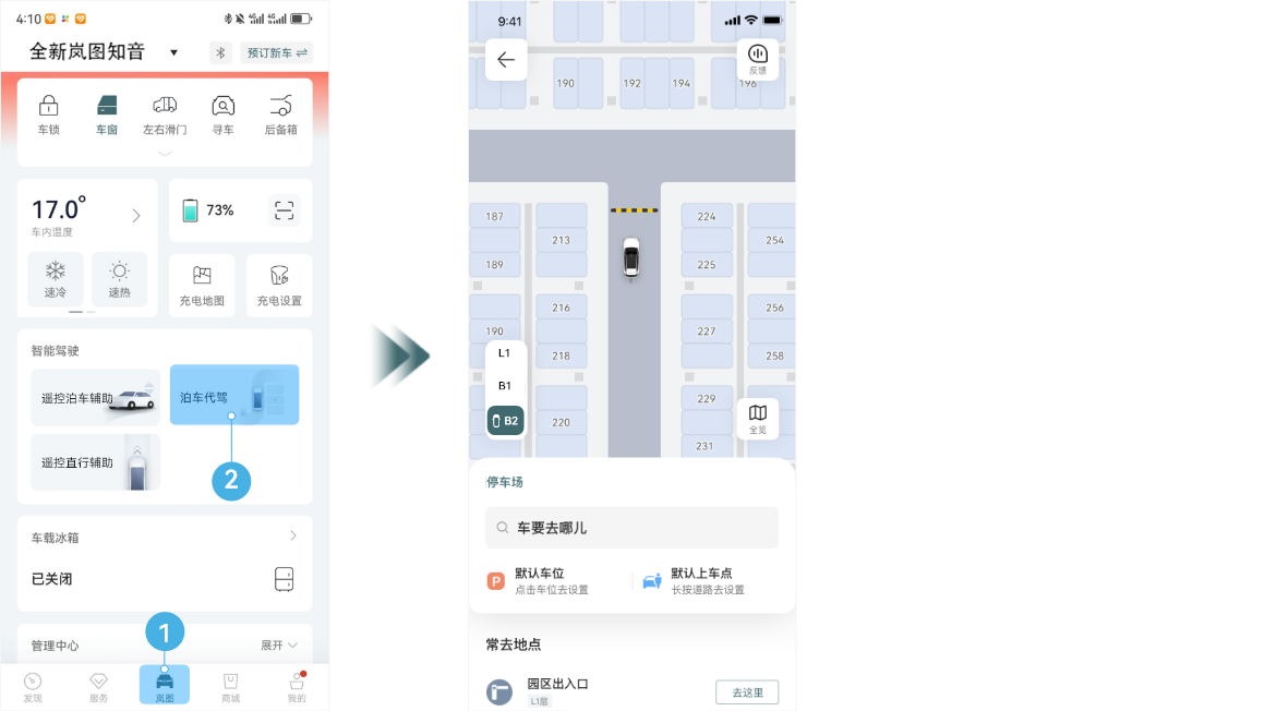 - 打开手机岚图汽车 APP,点触进入“岚图 > 泊车代驾”。