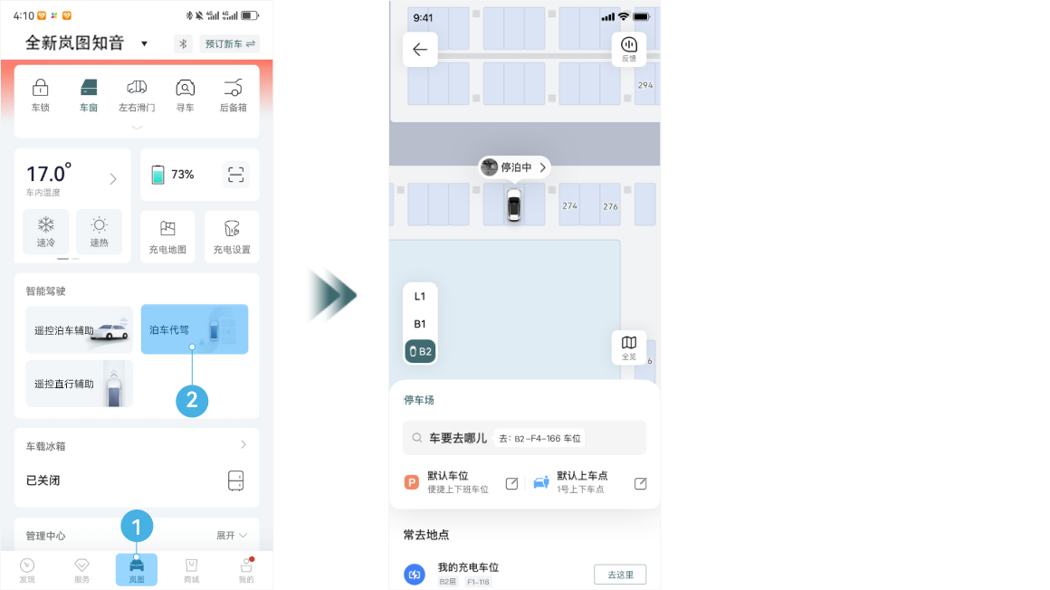 驾驶员可通过手机岚图汽车 APP 远程操作自车行驶,完成车辆自动启动、驶离车位,并行驶至指定的召唤点。