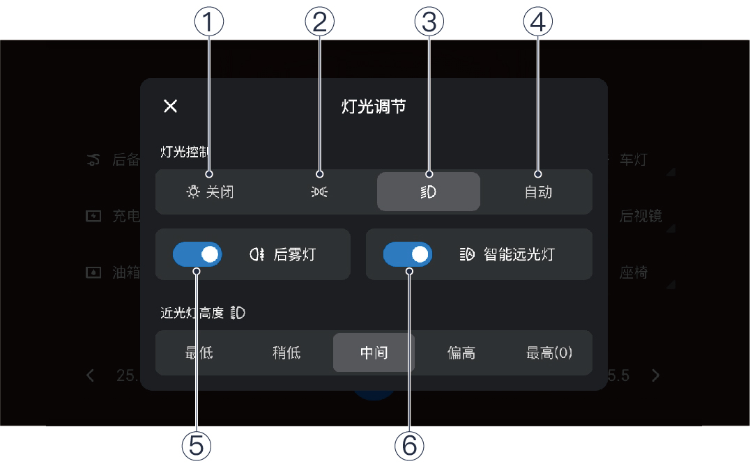 可在车控屏车灯界面,手动调节大灯照射高度,大灯照射高度包括最高、偏高、中间、稍低、最低五个级别。