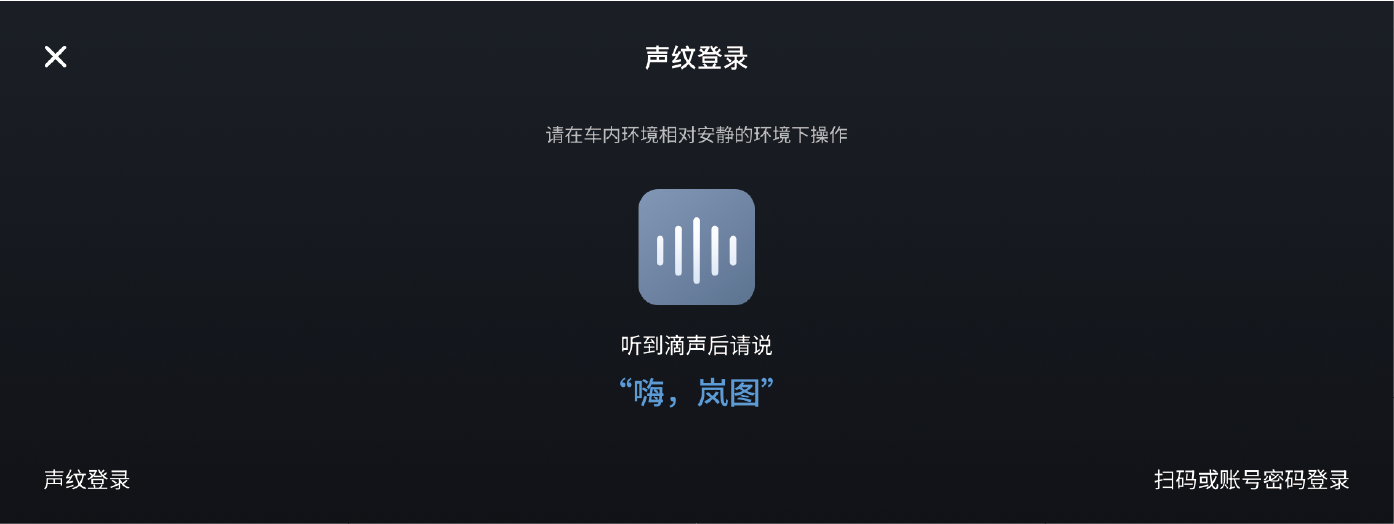 激活完成且登录车主账号后,可在中控屏全应用→个人中心界面,设置其他快捷登录方式,包括二维码 / 账号登录、FACE ID 登录和声纹登录。