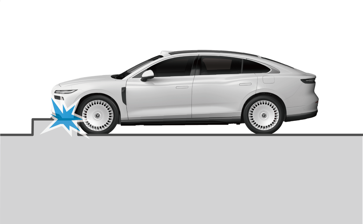 - 越过较深坑洼路面时,车头撞击地面。