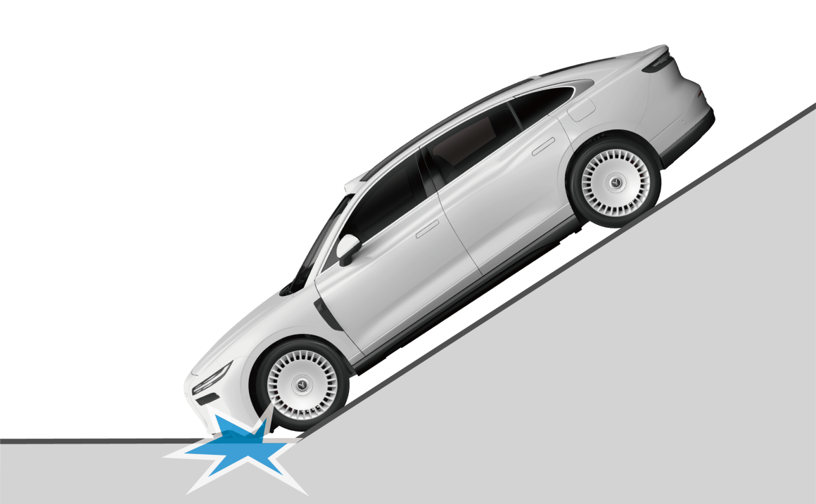 - 下陡坡时,车头碰撞到地面。