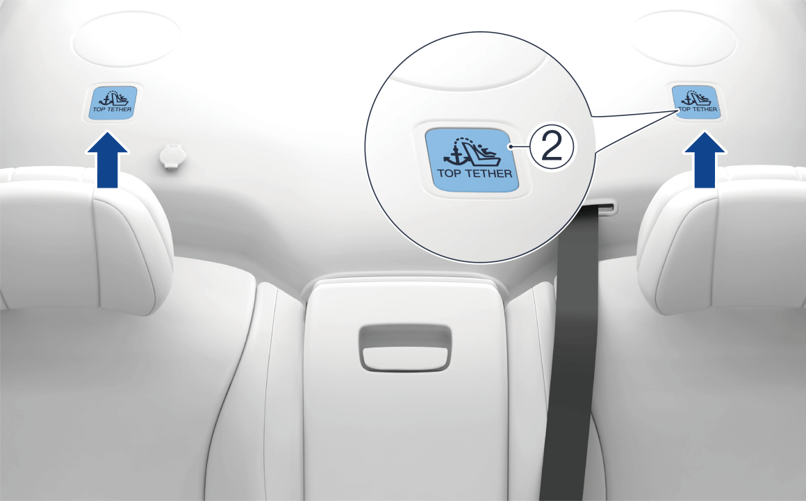 车辆后排座椅装备有 ISOFIX 固定系统,可用于儿童安全座椅的连接安装。该系统由下固定点 ① 和上拉带固定点 ② 组成。下固定点 ①,位于座椅靠背与座垫的缝隙内,用于安装带 ISOFIX 接口的儿童安全座椅,上拉带固定点 ② 位于座椅靠背后部。您可以根据儿童安全座椅类型及儿童安全座椅的安装说明书,选择上拉带固定点 ②、下固定点 ① 或三点式安全带用于配合安装。