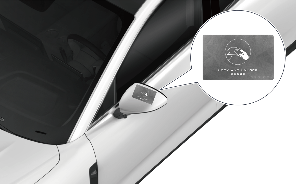 使用 NFC 卡片钥匙在车辆主驾外后视镜上方刷卡,可以完成车辆解锁和闭锁。