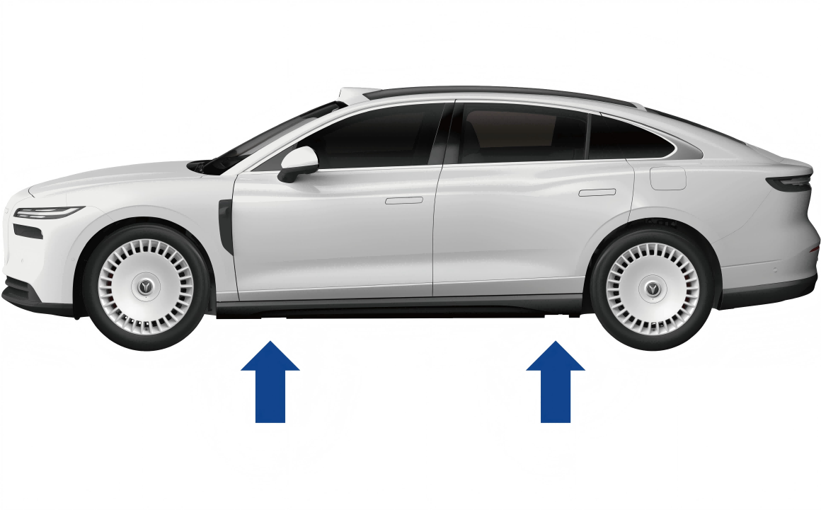 在进行底盘检修、轮胎更换等操作时,需将车辆进行举升,方便操作: