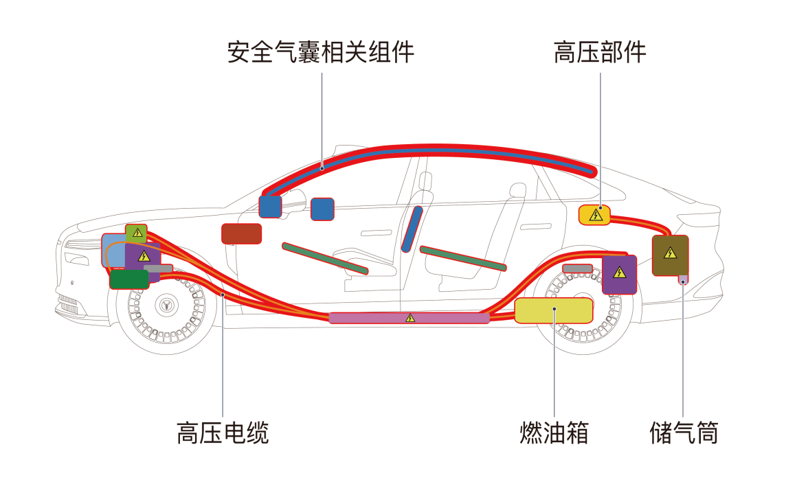 车辆高温、高压区域为禁止切割区域,如安全气囊相关组件、高电压部件、空气悬架储气筒等。其他部位如需切割,救援人员应穿戴专业防护装备,选用合适的切割设备进行切割操作。