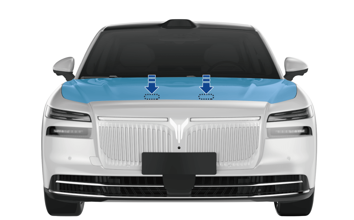 - 将双手放在前机舱盖的前端(如图所示),然后用力按下,将其完全关闭。