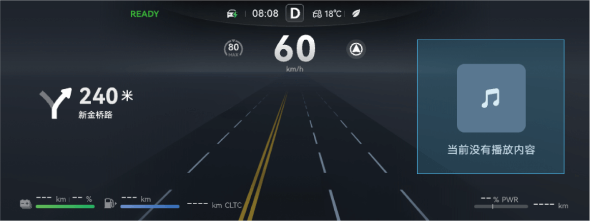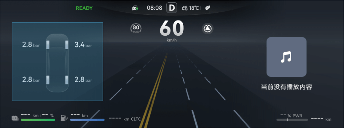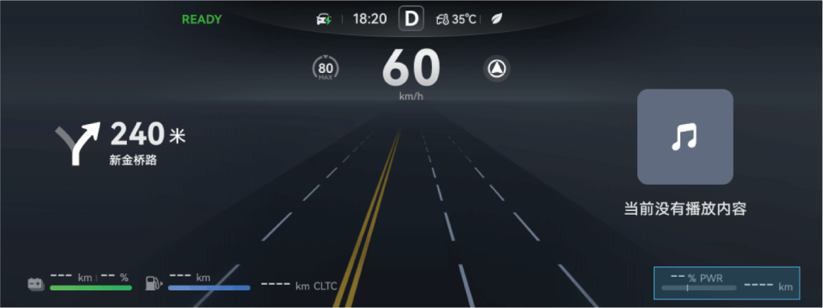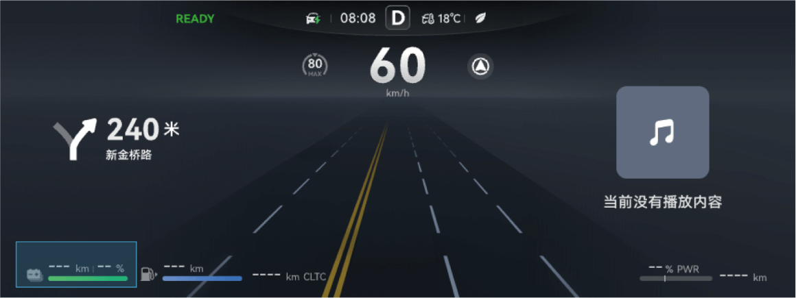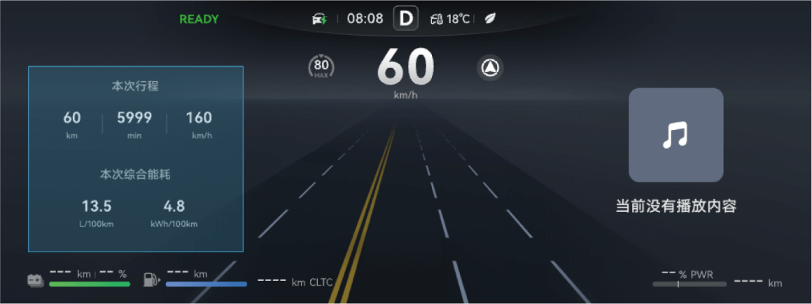 电源状态在 Ready 模式下,整车行驶时,仪表根据整车功率信号实时显示当前功率和制动能量回收功率。