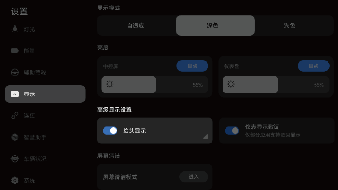 在中控屏进入“设置 > 显示 > 高级显示设置”,打开“抬头显示”开关。