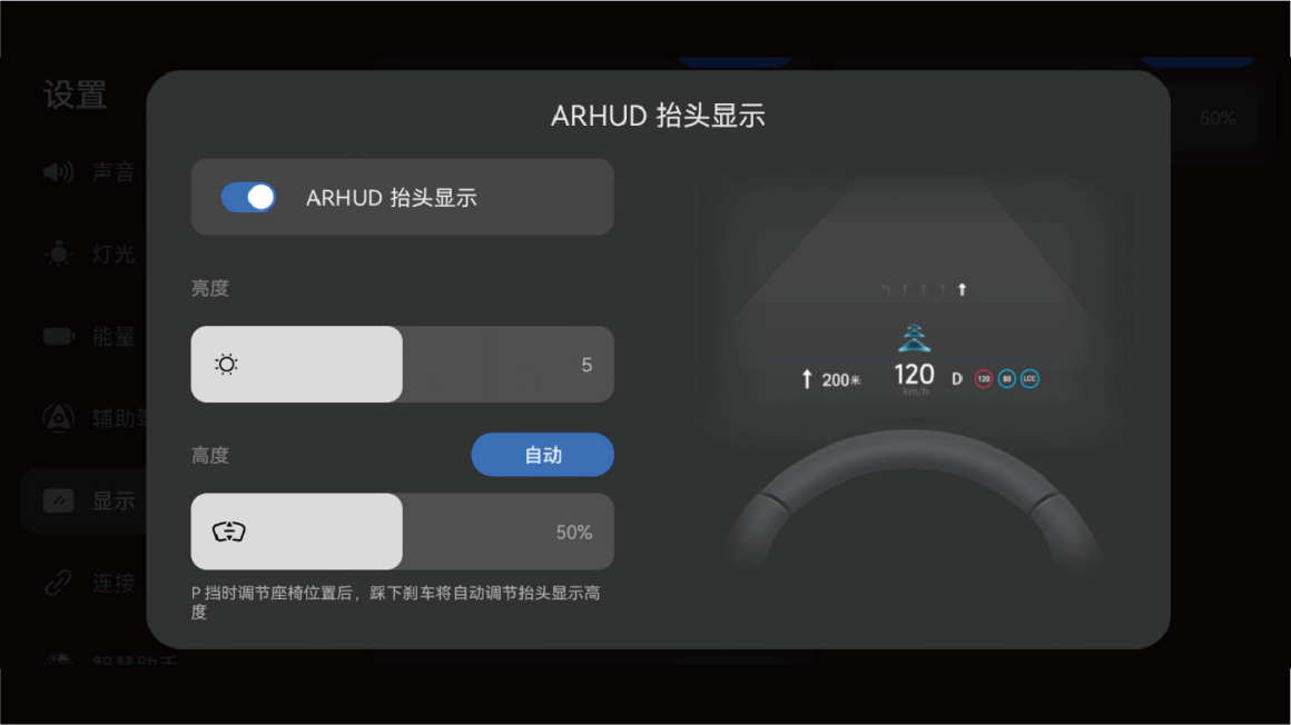 点击“抬头显示”开关,进入设置界面,调节抬头显示的亮度和高度。