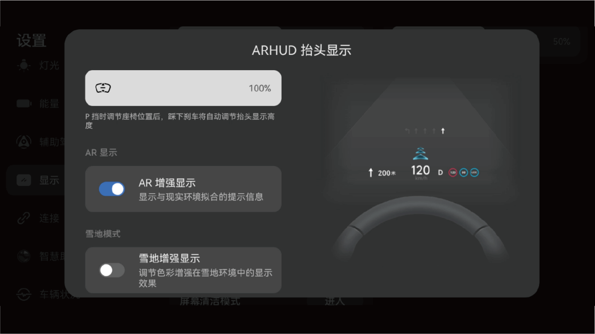 在“ ARHUD 抬头显示”卡片左侧区域向上滑动,打开 “AR 增强显示”开关,可在抬头显示的基础上叠加增强 AR 效果。打开“雪地增强显示”开关,可在雨雪天气增强抬头显示的效果。