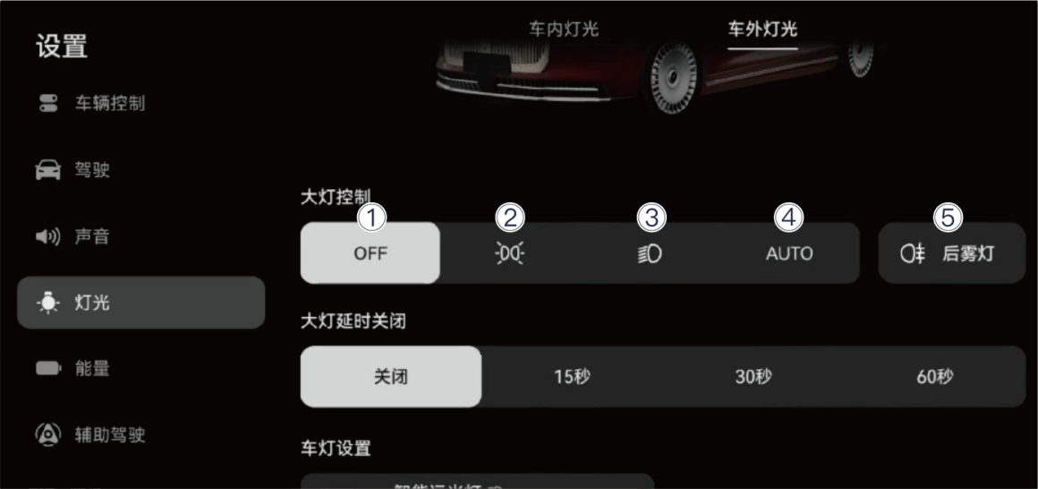 可在中控屏进入“设置 > 灯光 > 车外灯光 ”,设置大灯延时关闭时间:关闭、15 秒、30 秒、60 秒。