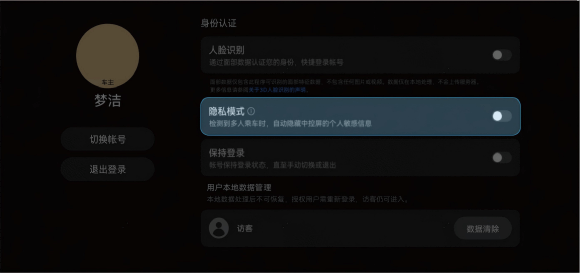 副驾或后排座椅感应到有人乘坐时,系统自动进入隐私模式;副驾与后排乘客全部下车时,隐私模式自动退出。