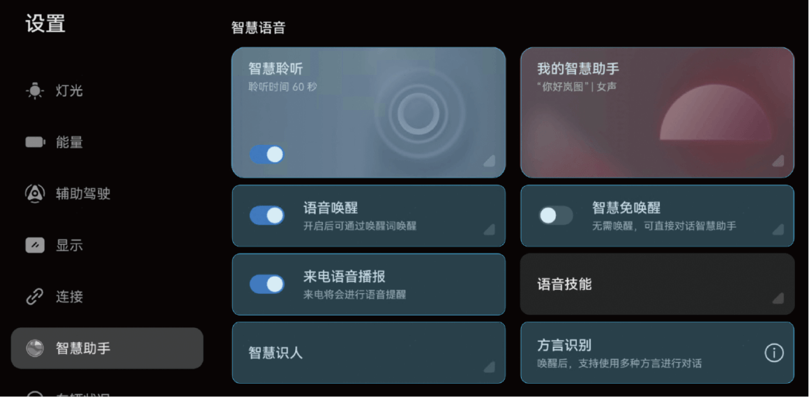 您可以在中控屏上点击“设置 > 智慧助手”,在智慧语音界面中设置如下功能。