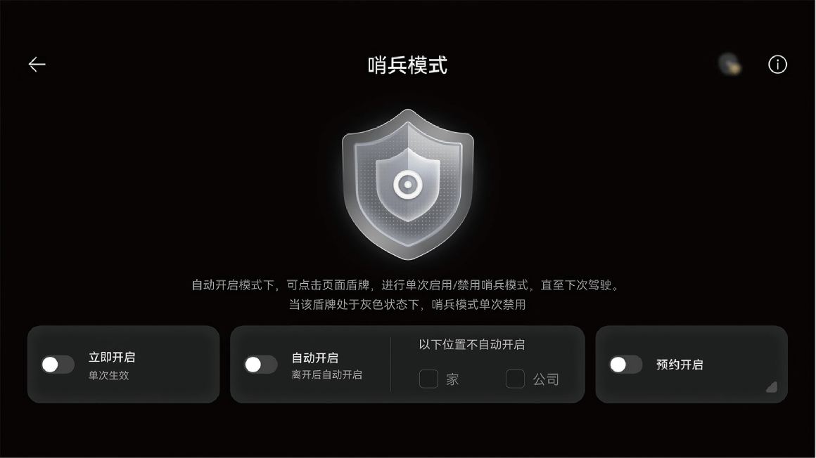 - 自动开启:启用后,车辆会在驾驶员离开车辆并锁车时,约 1 分钟内自动开启哨兵模式。自动开启长期生效,驾驶员无需每次手动开启。若车辆中控屏中已经设置了“家”、“公司”两个常用地点的地址,则驾驶员还可以设置在这两个位置不自动开启哨兵模式,以减少电量与车辆组件寿命消耗。