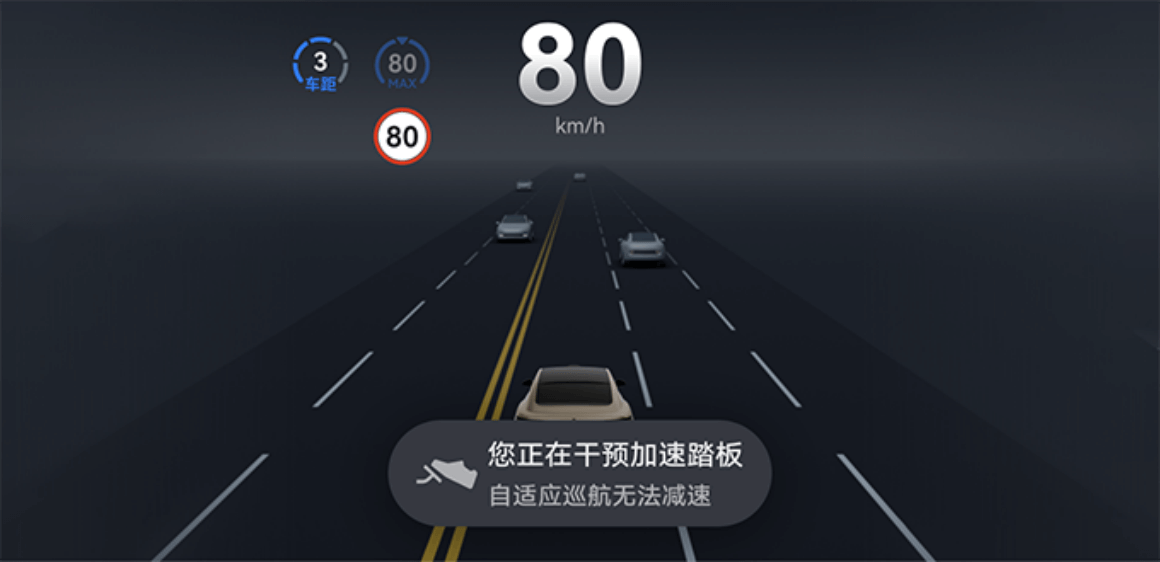 驾驶员干预加速踏板使车速超过 130 km/h 时系统会抑制驾驶员加速,并在仪表屏显示“请松开加速踏板,已为您限制车速”,加速到车速超过 135 km/h 或持续干预加速踏板超过规定时长会导致 ACC 退出,请注意仪表屏提示,及时终止干预加速踏板或立即人工接管车辆。