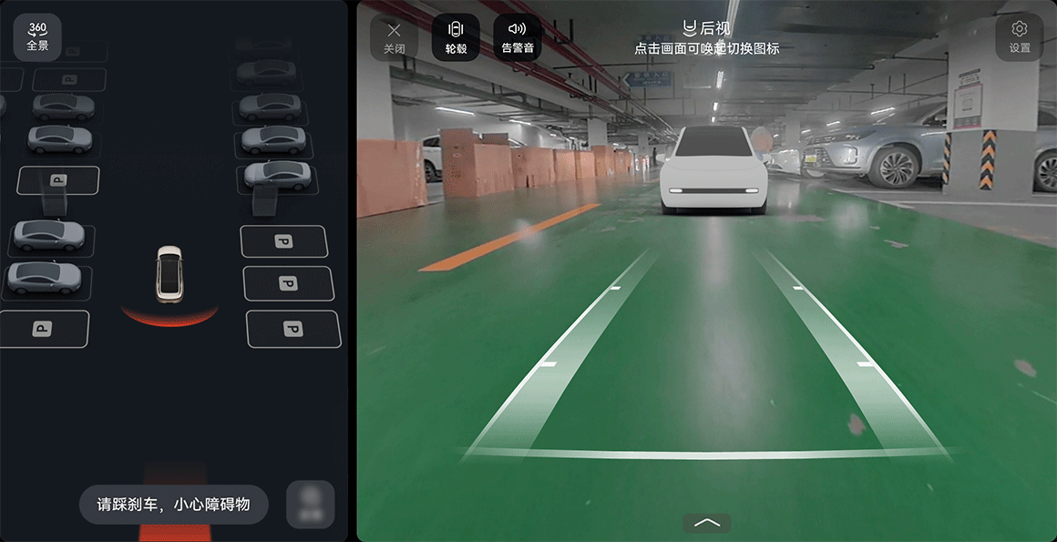 实施 RAEB 时,中控屏上会在自车后方显示动态红色弧线,并将风险目标红色高亮显示,伴有“请踩刹车”的文字提示,提醒驾驶员采取制动措施。