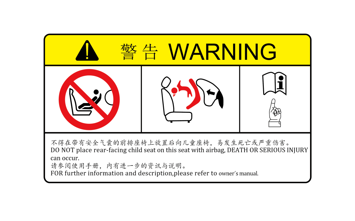 - 请勿让儿童坐于前排座椅上,否则气囊展开时会对儿童造成严重伤害。