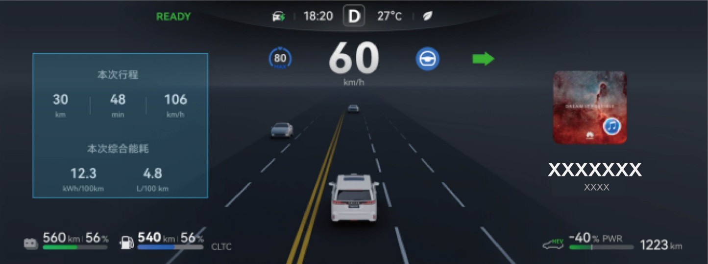 电源状态在 READY 模式下,整车行驶时,仪表根据整车功率信号实时显示当前功率和制动能量回收功率。