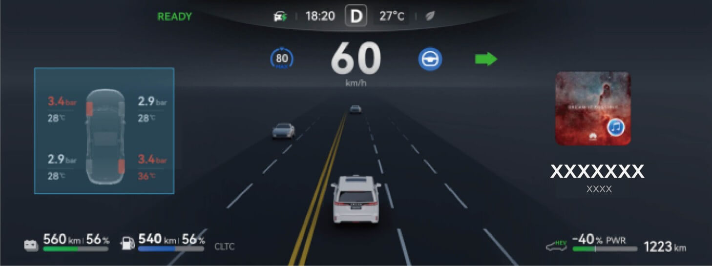 按压方向盘上的菜单按键可以设置组合仪表左侧信息区域,设置您想查看的信息,包括导航信息、能量流动、胎压信息、里程信息等。(以下示意图均以混动车型为例)