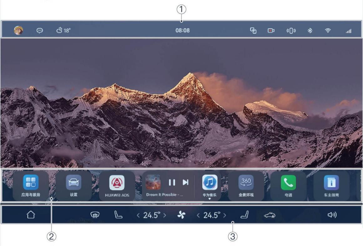 | ③ | 工具栏 | - 便捷操作常用功能,例如:前除霜、空调与座椅调节、自动循环模式、音量开关。 - 长按 Home 键进入多任务中心,可以快速查看、进入、关闭最近任务。 |