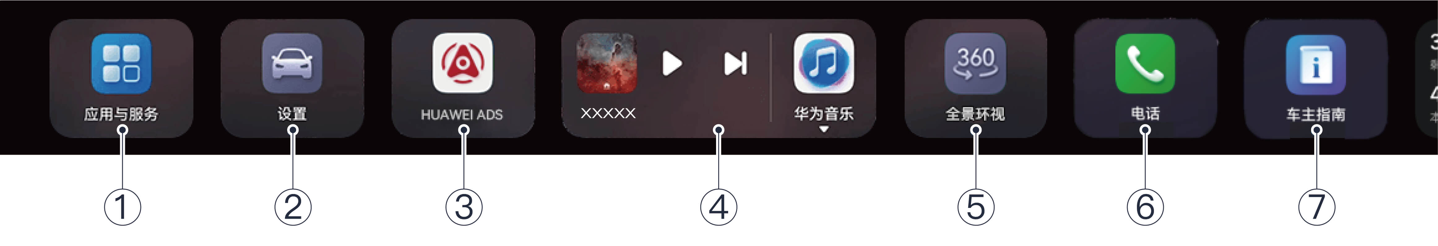 | ② | 快捷栏 | - 快速直达应用或服务。 - 左右滑动查看,可以自定义添加高频使用的应用或服务卡片。 - 应用与服务、设置、HUAWEI ADS、音频卡片、全景环视是常驻卡片,固定无法删除。 |