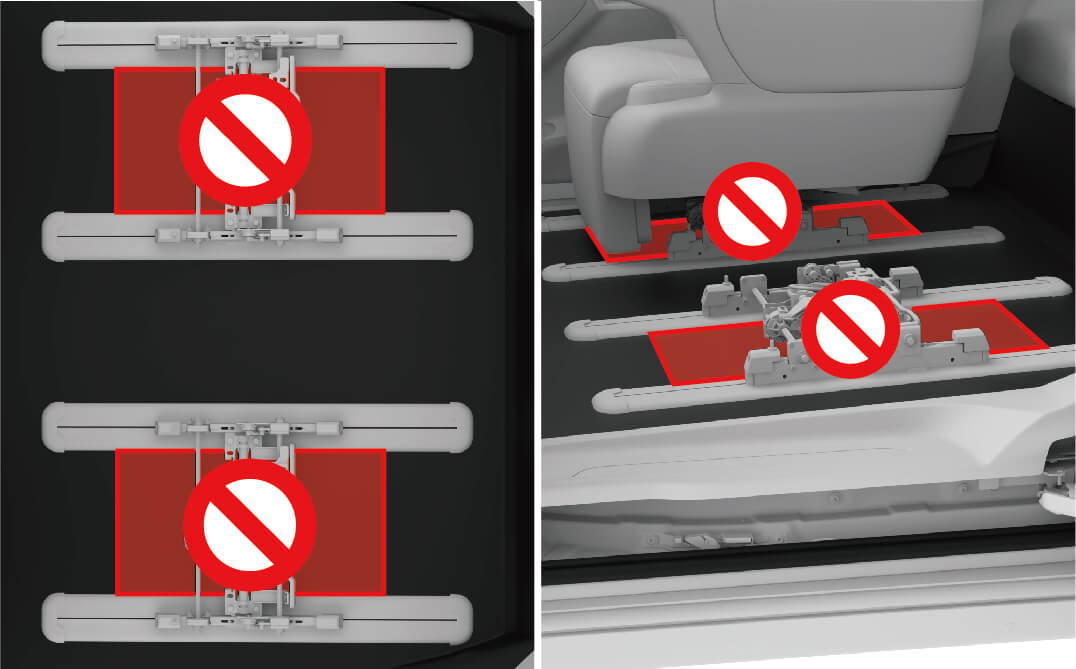 - 以加装地板为例,下图座椅下方区域里不允许铺设地板,与线束接触的地板边缘需光滑无毛刺,金属地板还需包裹保护,否则可能因线束运动磨损影响车辆正常使用、甚至还有电路短路的风险。如加装地板与二排座椅腿托间隙过小,可能会导致腿托在抬升、伸缩调节过程中与地板产生干涉,造成二排座椅腿托面套损坏。