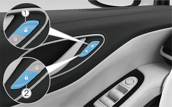 - 将锁栓 ① 后推,解锁对应电动滑移门;向后拉内拉手 ②,可打开对应侧电动滑移门。