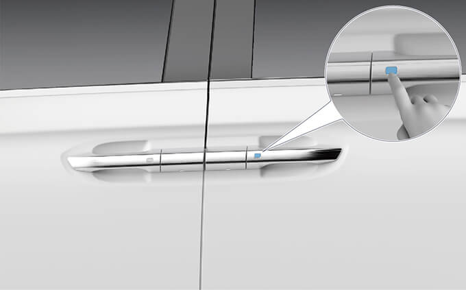 车辆解锁时,按下滑移门外把手上的按钮(上图所示),可控制对应侧滑移门电动开启、关闭或暂停运行。