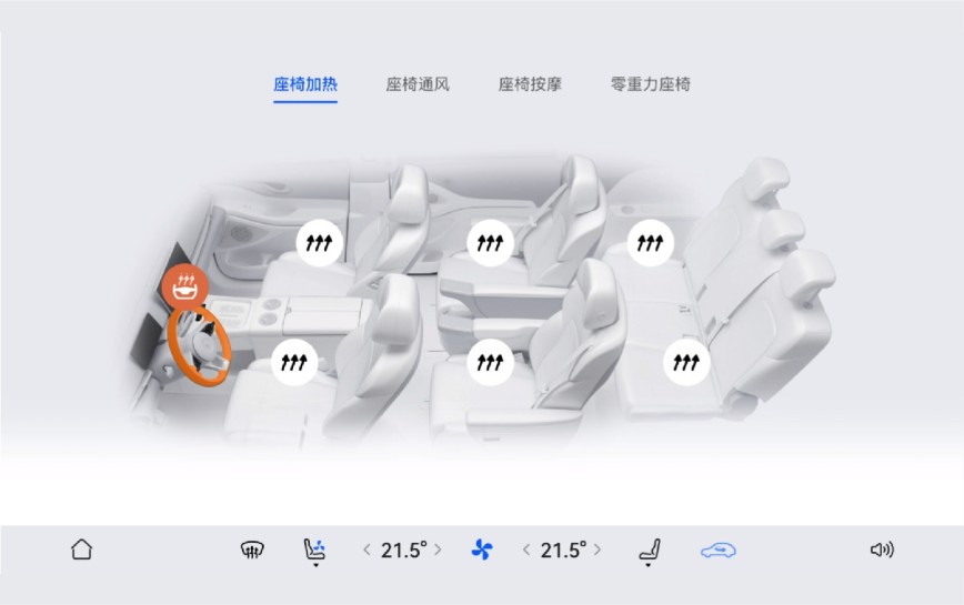 座椅界面,点触方向盘加热按键,按键灯点亮,加热功能开启;再次点触该按键,按键灯熄灭,加热功能关闭。