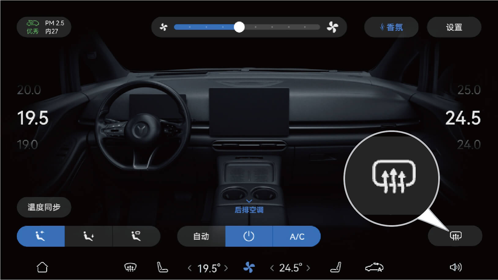 按键,按键指示灯点亮,开启加热功能,可清除外后视镜与后挡风玻璃上的雾气或冰霜,再次点触该按键,关闭加热功能,按键指示灯熄灭。