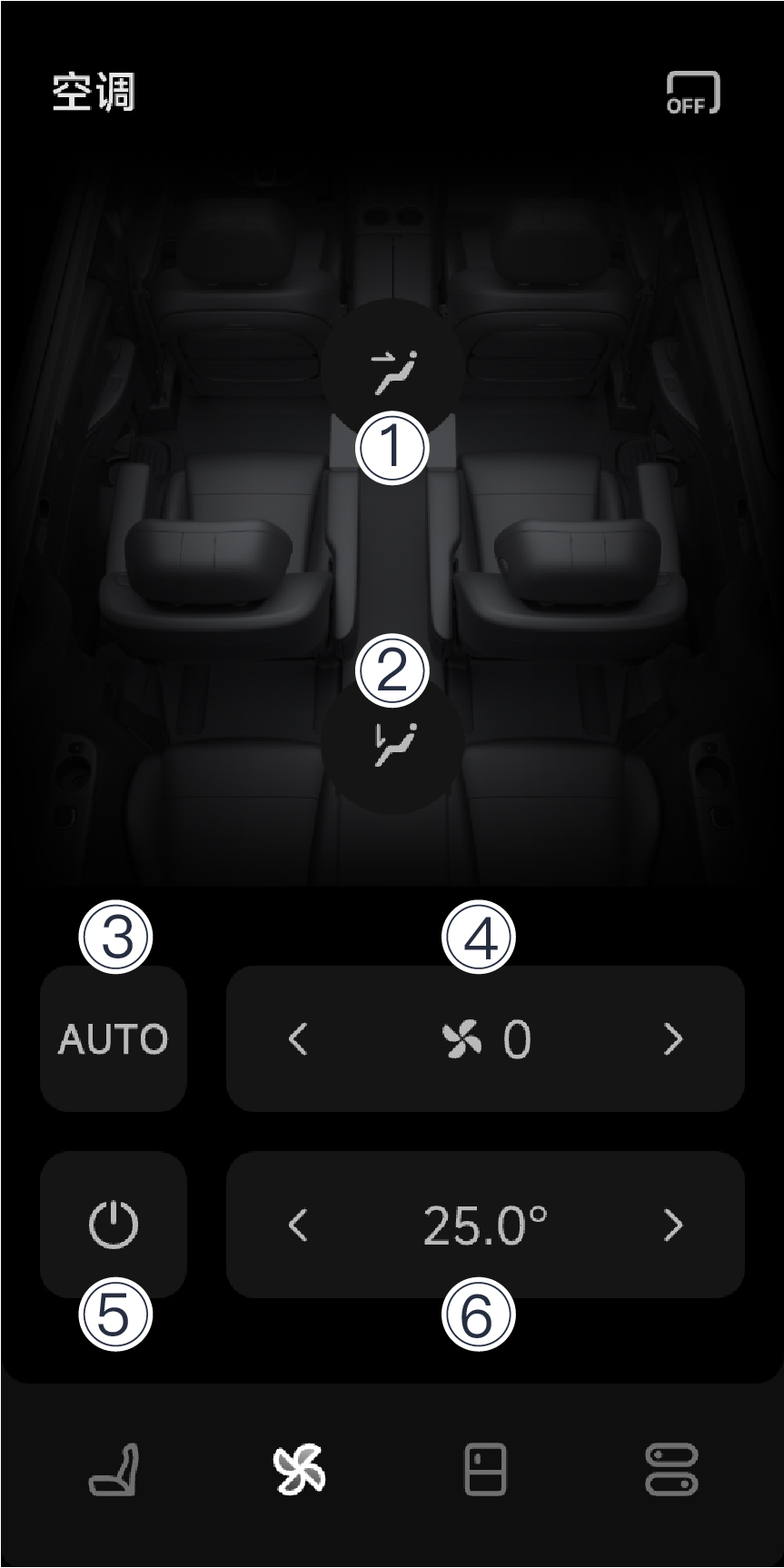 | ⑤ 开关空调 | 开启或关闭后排空调。 |