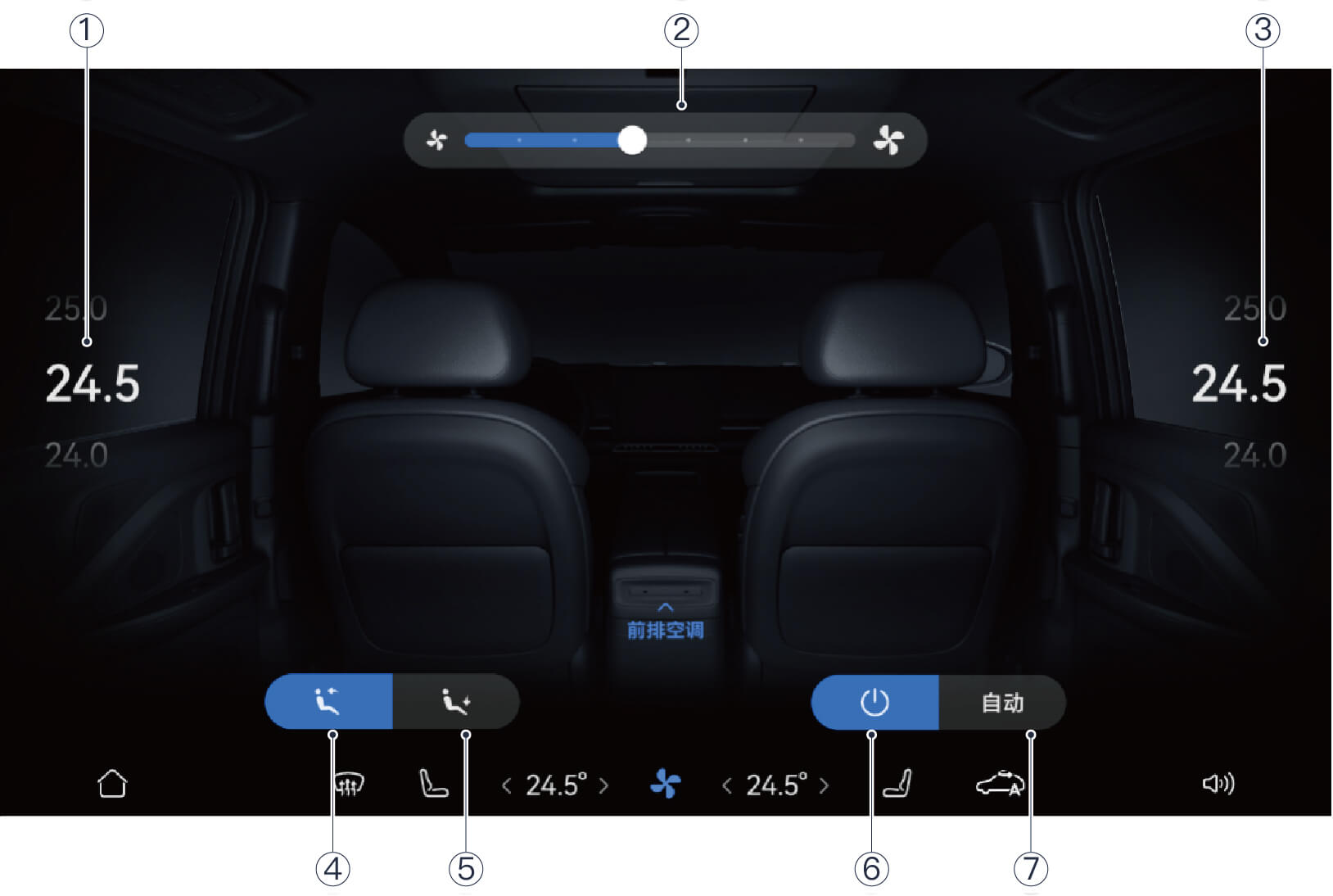 | ① 主驾温度 | 上下滑动调节主驾侧温度。 |