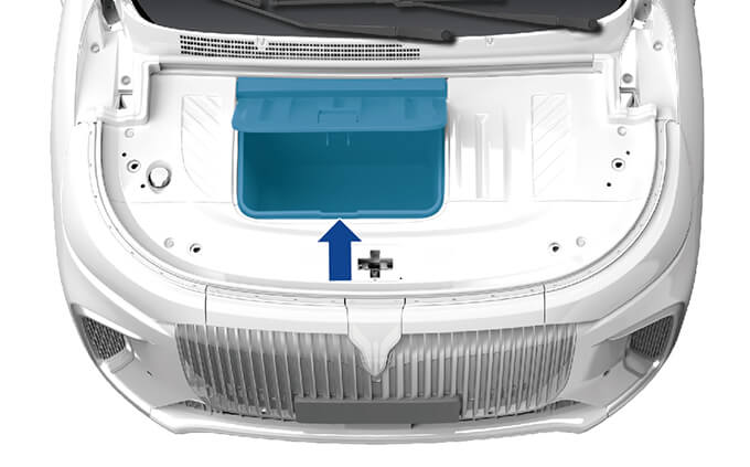 前行李箱(纯电车型)位于前机舱内。打开前机舱罩,上提前行李箱开启手柄即可开启前行李箱,可用于装载物品。